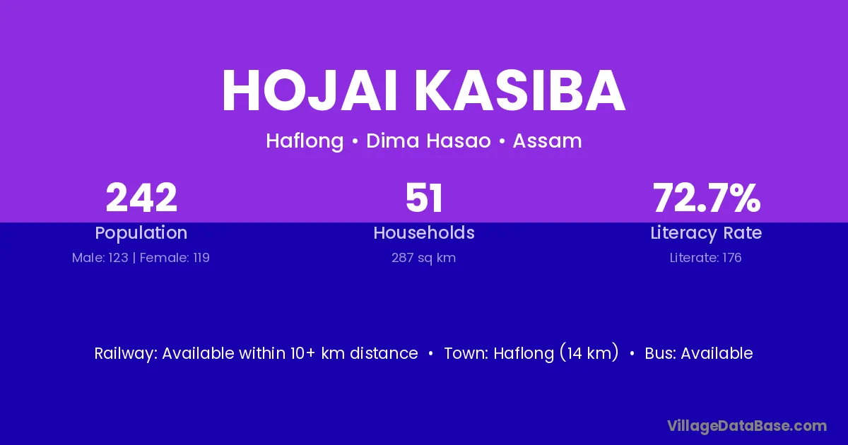 Haflong (14 km) is the nearest town to Hojai Kasiba village for major economic activities and is located approximately 14 km away.