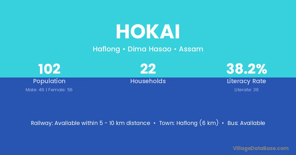 Haflong (6 km) is the nearest town to Hokai village for major economic activities and is located approximately 6 km away.