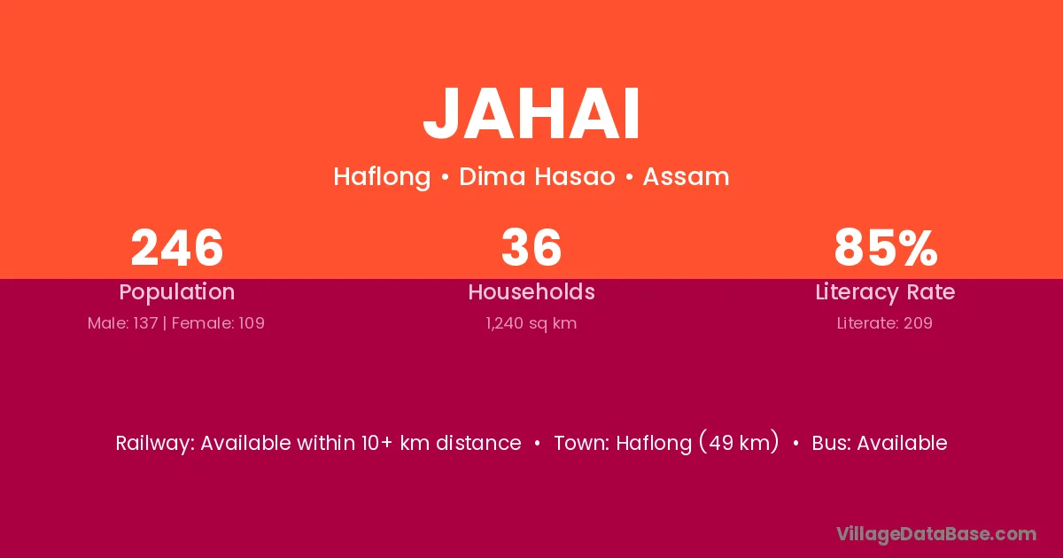 Haflong (49 km) is the nearest town to Jahai village for major economic activities and is located approximately 49 km away.