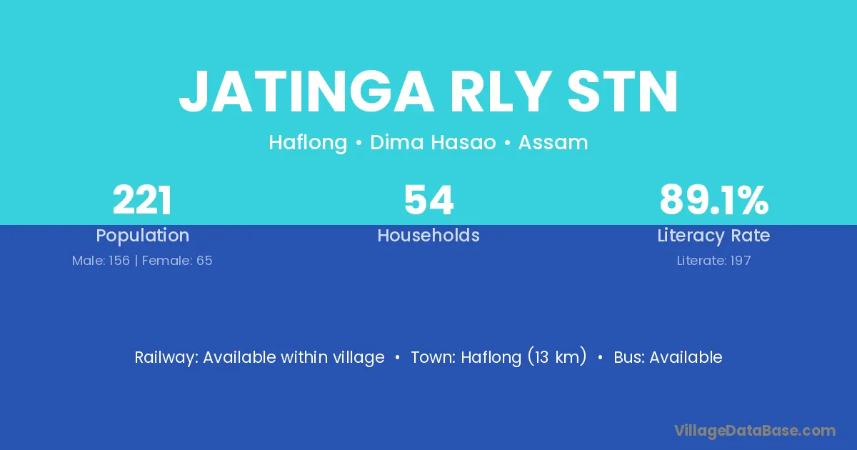 Jatinga Rly Stn village has a total population of 221 people, of which 156 are males and 65 are females.
