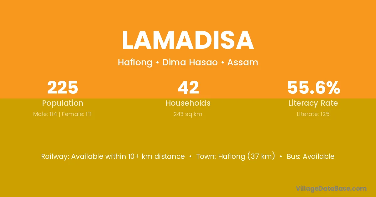 Haflong (37 km) is the nearest town to Lamadisa village for major economic activities and is located approximately 37 km away.