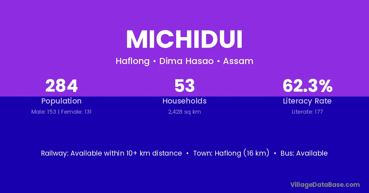 Haflong (16 km) is the nearest town to Michidui village for major economic activities and is located approximately 16 km away.