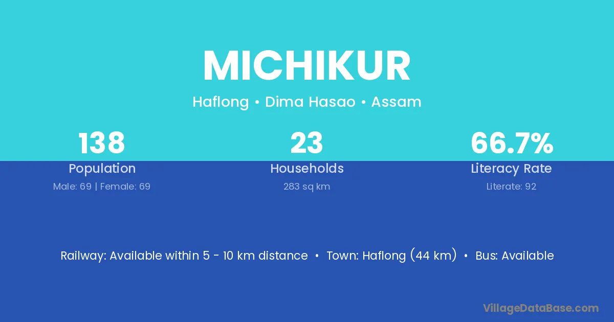 Haflong (44 km) is the nearest town to Michikur village for major economic activities and is located approximately 44 km away.