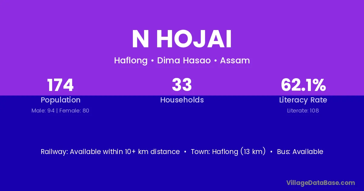 Haflong (13 km) is the nearest town to N Hojai village for major economic activities and is located approximately 13 km away.