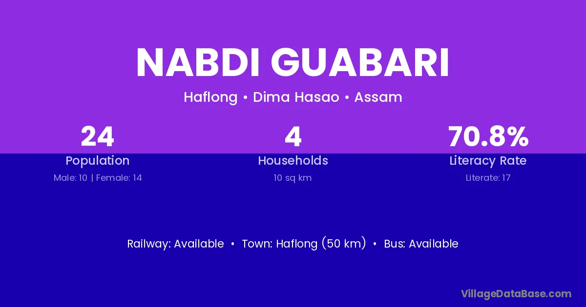 Haflong (50 km) is the nearest town to Nabdi Guabari village for major economic activities and is located approximately 50 km away.