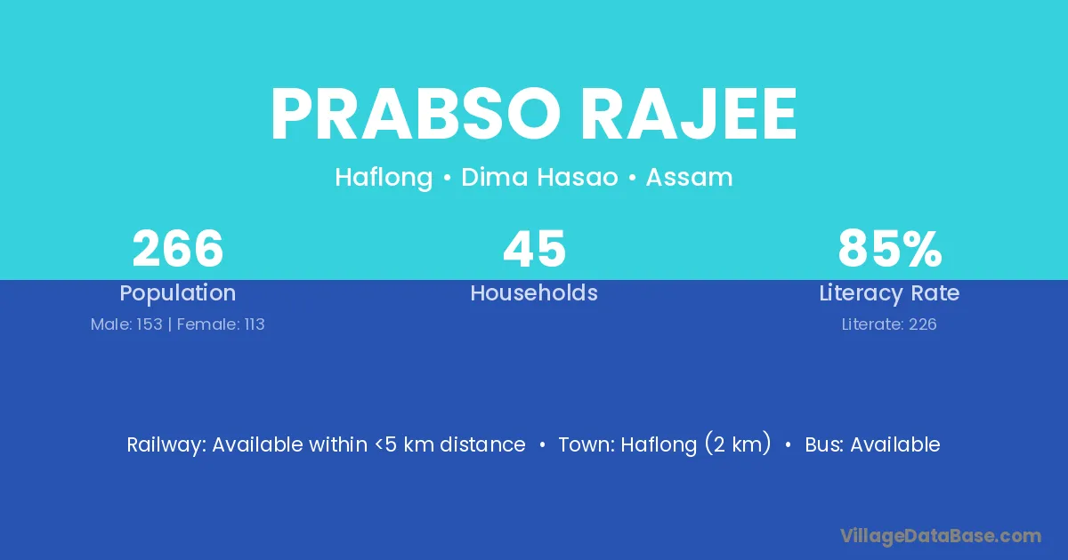 Haflong (2 km) is the nearest town to Prabso Rajee village for major economic activities and is located approximately 2 km away.