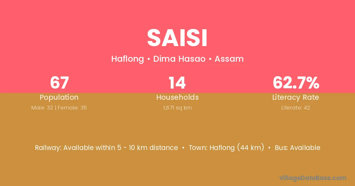 Haflong (44 km) is the nearest town to Saisi village for major economic activities and is located approximately 44 km away.
