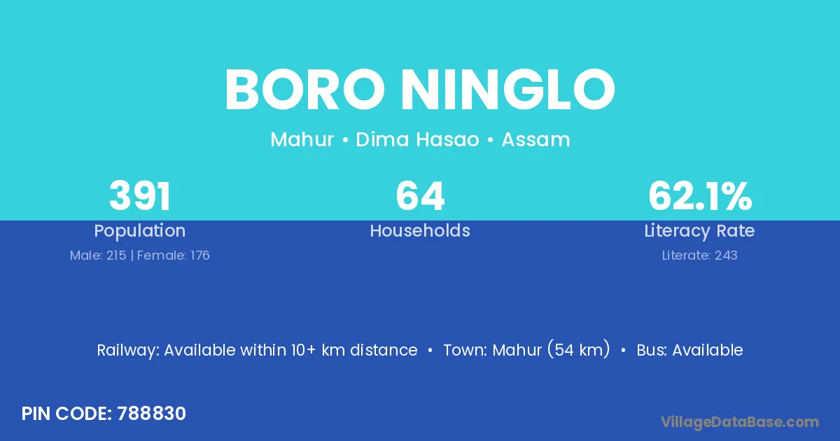 Mahur (54 km) is the nearest town to Boro Ninglo village for major economic activities and is located approximately 54 km away.