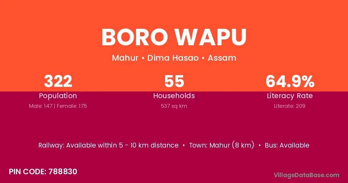 Mahur (8 km) is the nearest town to Boro Wapu village for major economic activities and is located approximately 8 km away.