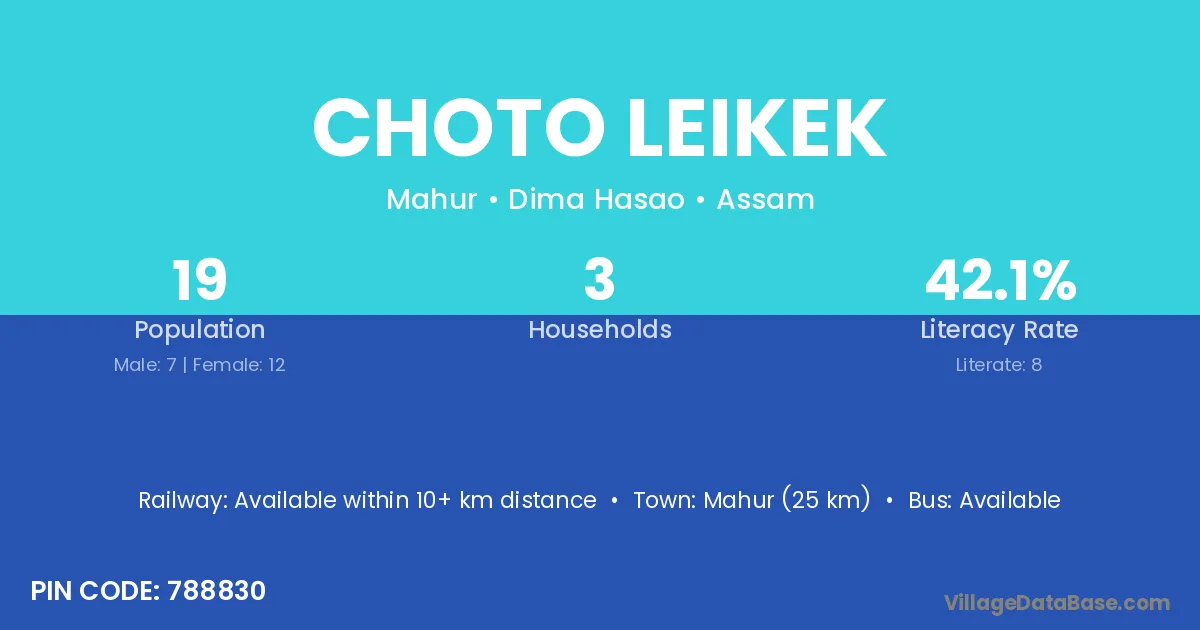 Choto Leikek village has a total population of 19 people, of which 7 are males and 12 are females.