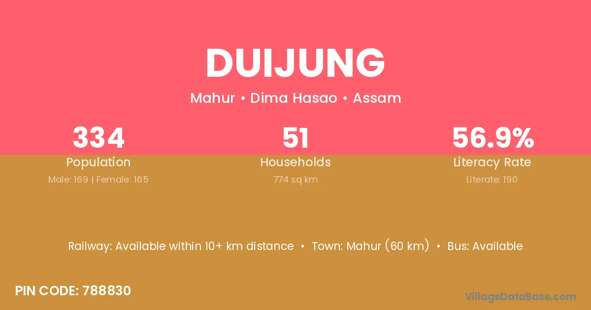 Mahur (60 km) is the nearest town to Duijung village for major economic activities and is located approximately 60 km away.