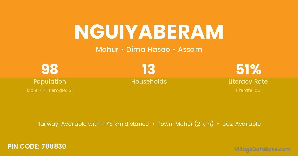 Nguiyaberam village has a total population of 98 people, of which 47 are males and 51 are females.