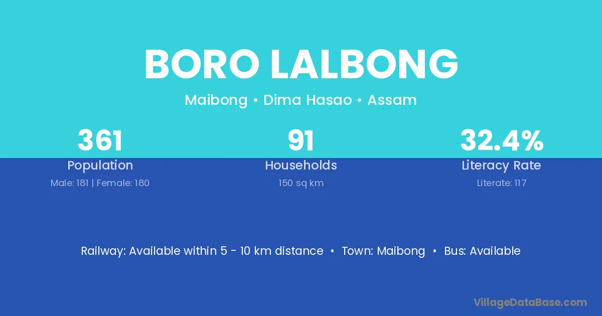 Boro Lalbong village has a total population of 361 people, of which 181 are males and 180 are females.