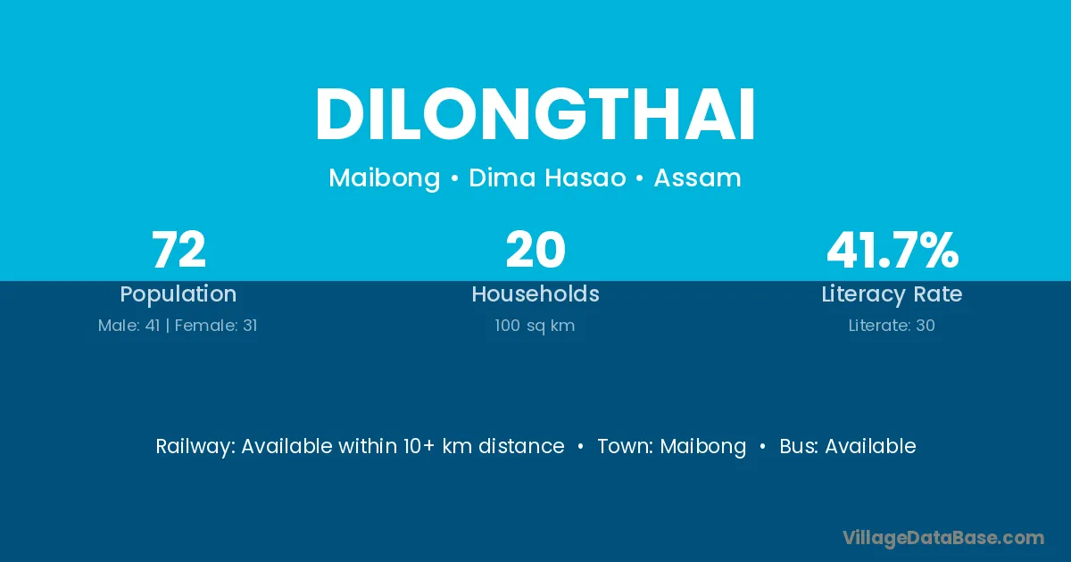 Dilongthai village has a total population of 72 people, of which 41 are males and 31 are females.