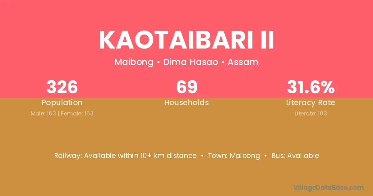 Kaotaibari Ii village has a total population of 326 people, of which 163 are males and 163 are females.
