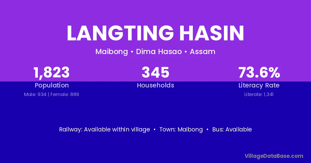 Langting Hasin village has a total population of 1,823 people, of which 934 are males and 889 are females.