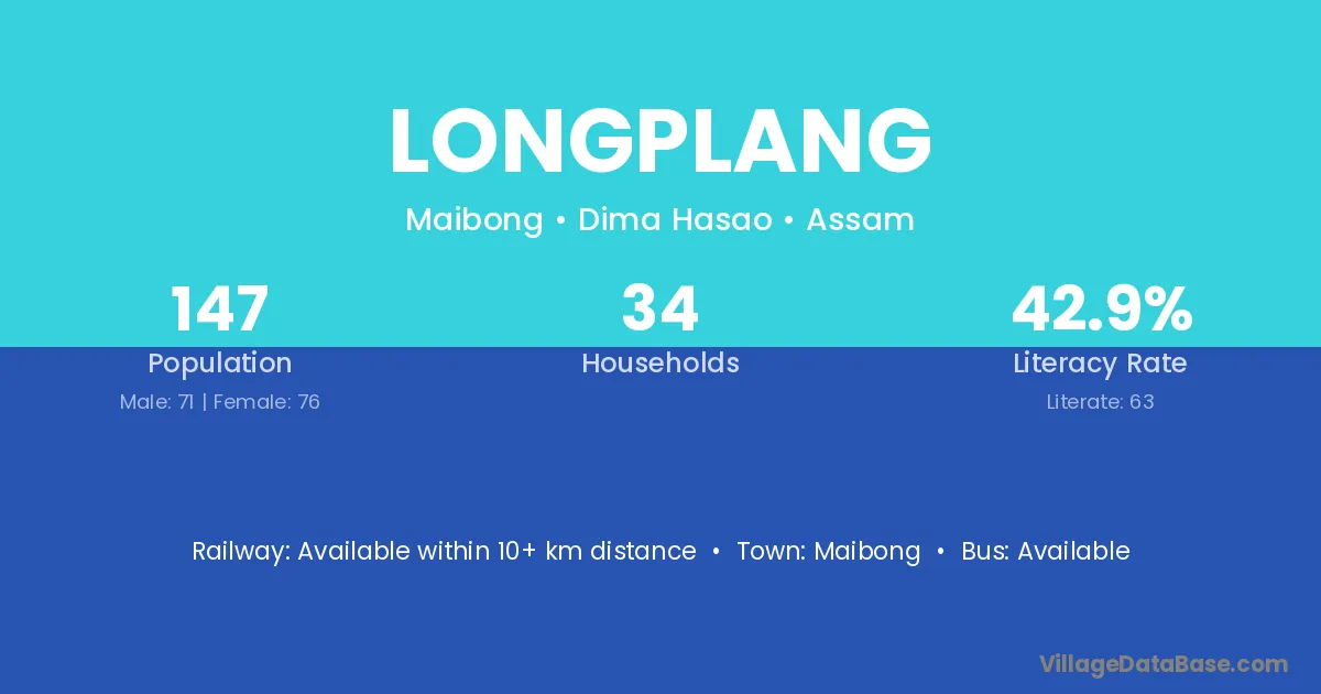 Longplang village has a total population of 147 people, of which 71 are males and 76 are females.
