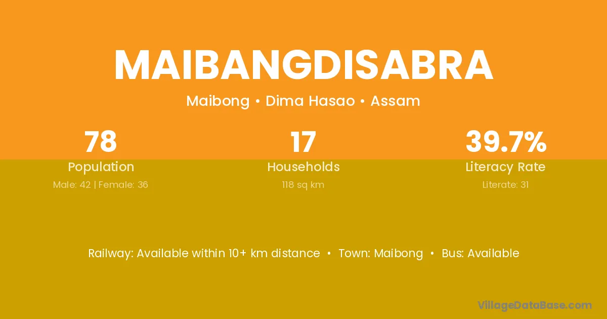 Maibangdisabra village has a total population of 78 people, of which 42 are males and 36 are females.