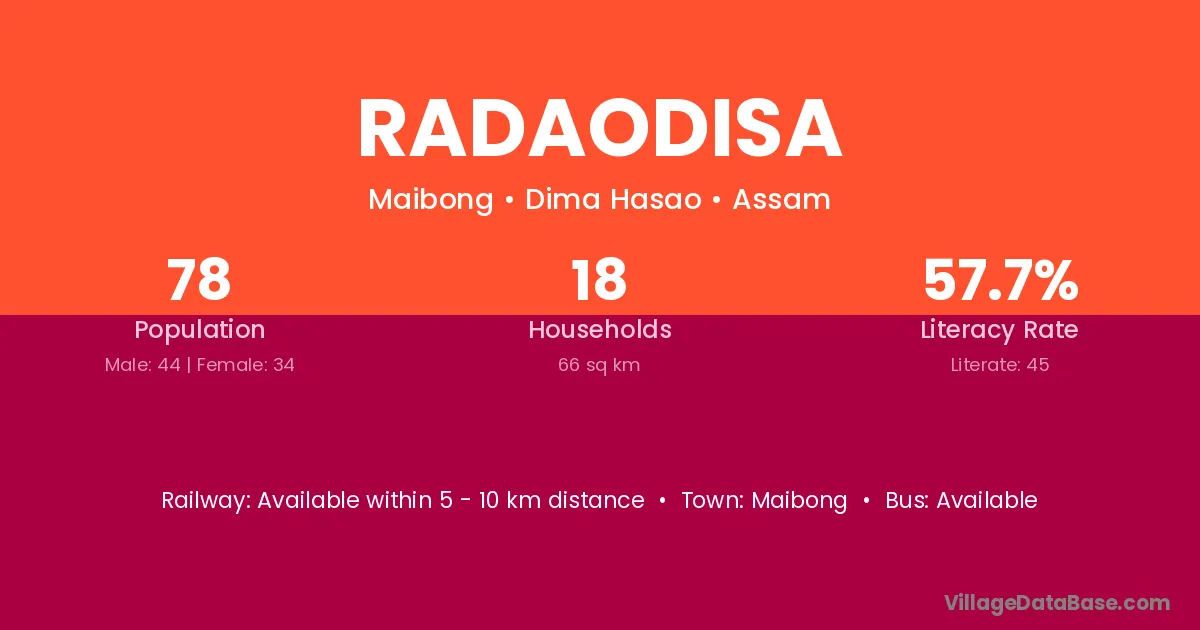 Radaodisa village has a total population of 78 people, of which 44 are males and 34 are females.