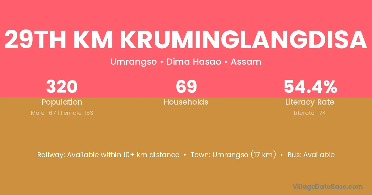 29th Km Kruminglangdisa village has a total population of 320 people, of which 167 are males and 153 are females.