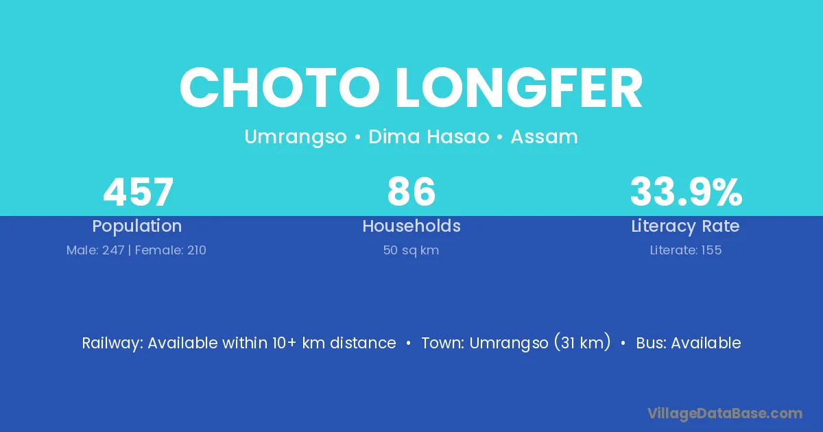 Umrangso (31 km) is the nearest town to Choto Longfer village for major economic activities and is located approximately 31 km away.