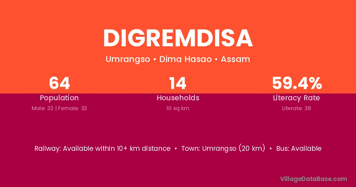 Umrangso (20 km) is the nearest town to Digremdisa village for major economic activities and is located approximately 20 km away.