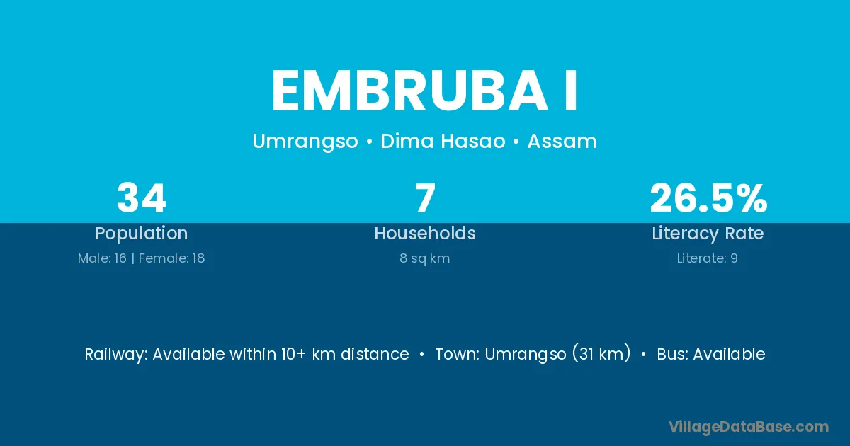 Umrangso (31 km) is the nearest town to Embruba I village for major economic activities and is located approximately 31 km away.