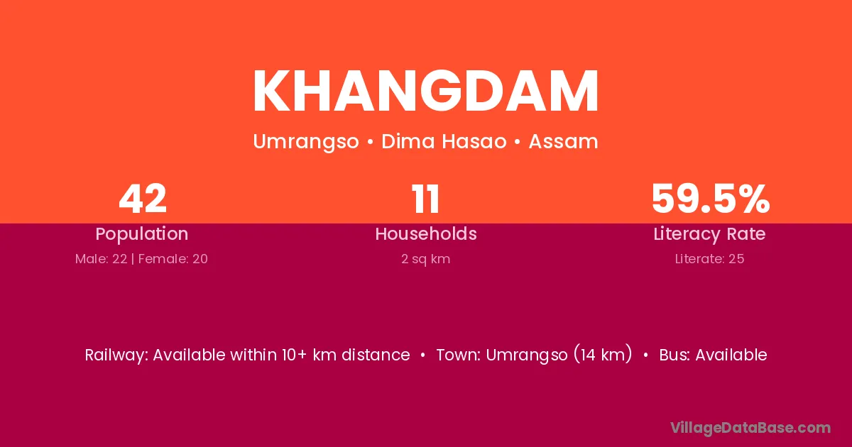 Khangdam village has a total population of 42 people, of which 22 are males and 20 are females.