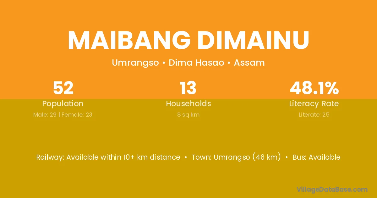Umrangso (46 km) is the nearest town to Maibang Dimainu village for major economic activities and is located approximately 46 km away.
