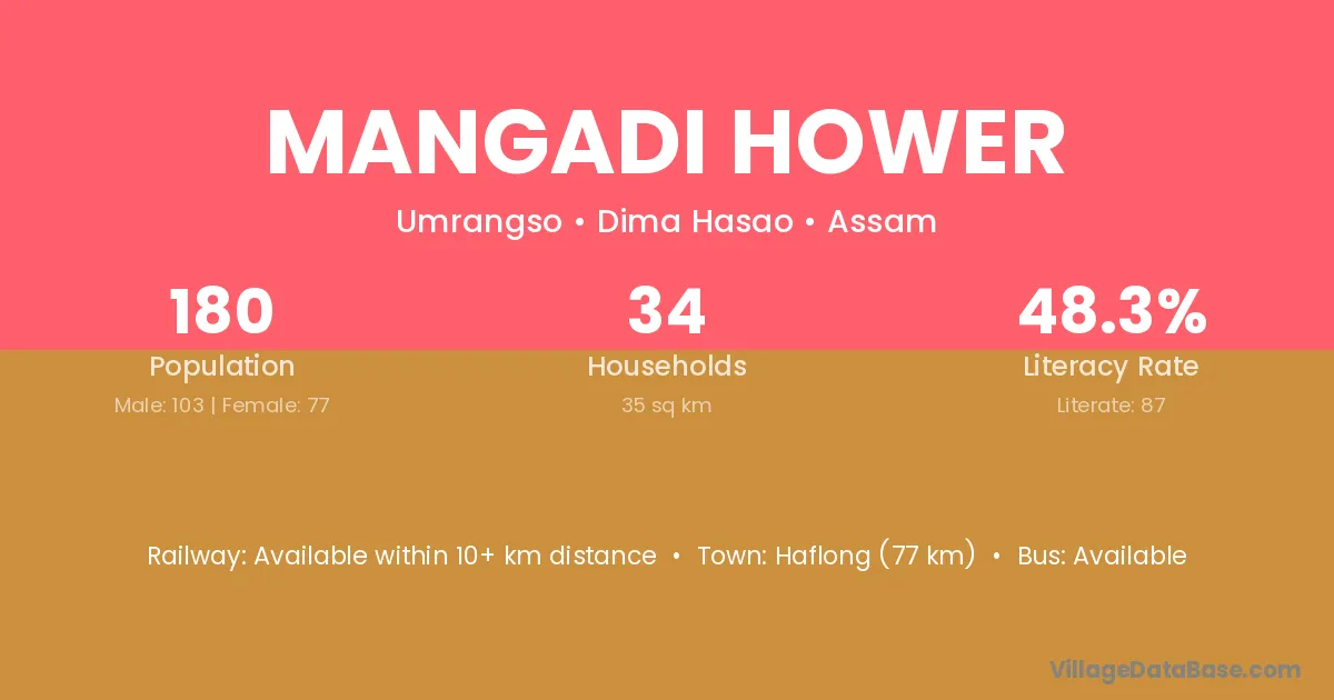 Haflong (77 km) is the nearest town to Mangadi Hower village for major economic activities and is located approximately 77 km away.