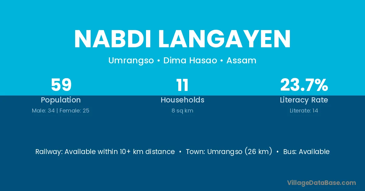 Umrangso (26 km) is the nearest town to Nabdi Langayen village for major economic activities and is located approximately 26 km away.