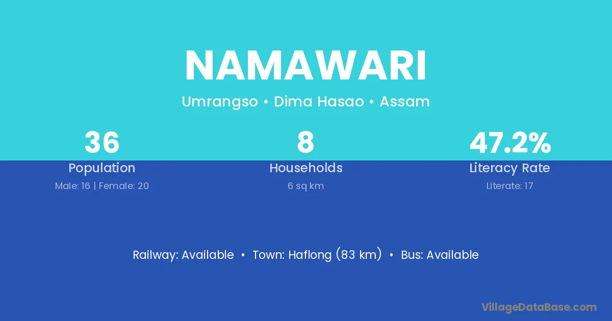 Haflong (83 km) is the nearest town to Namawari village for major economic activities and is located approximately 83 km away.