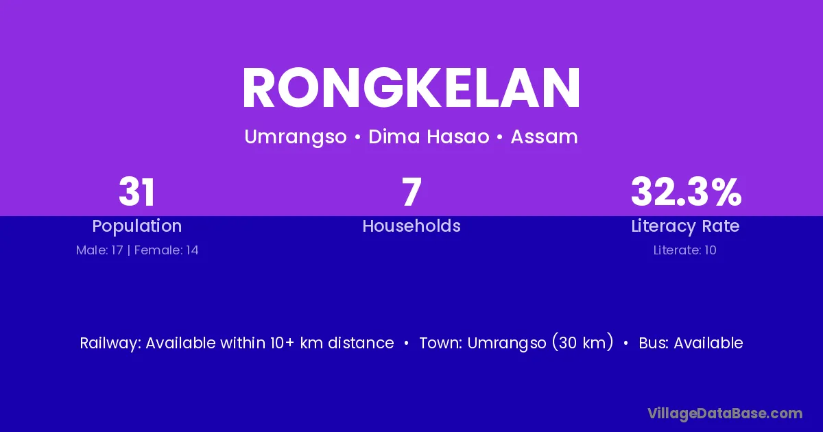 Umrangso (30 km) is the nearest town to Rongkelan village for major economic activities and is located approximately 30 km away.