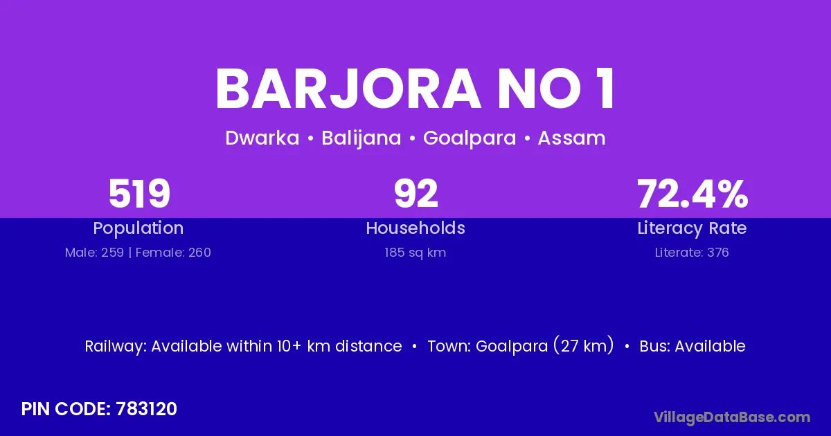 Goalpara (27 km) is the nearest town to Barjora No 1 village for major economic activities and is located approximately 27 km away.