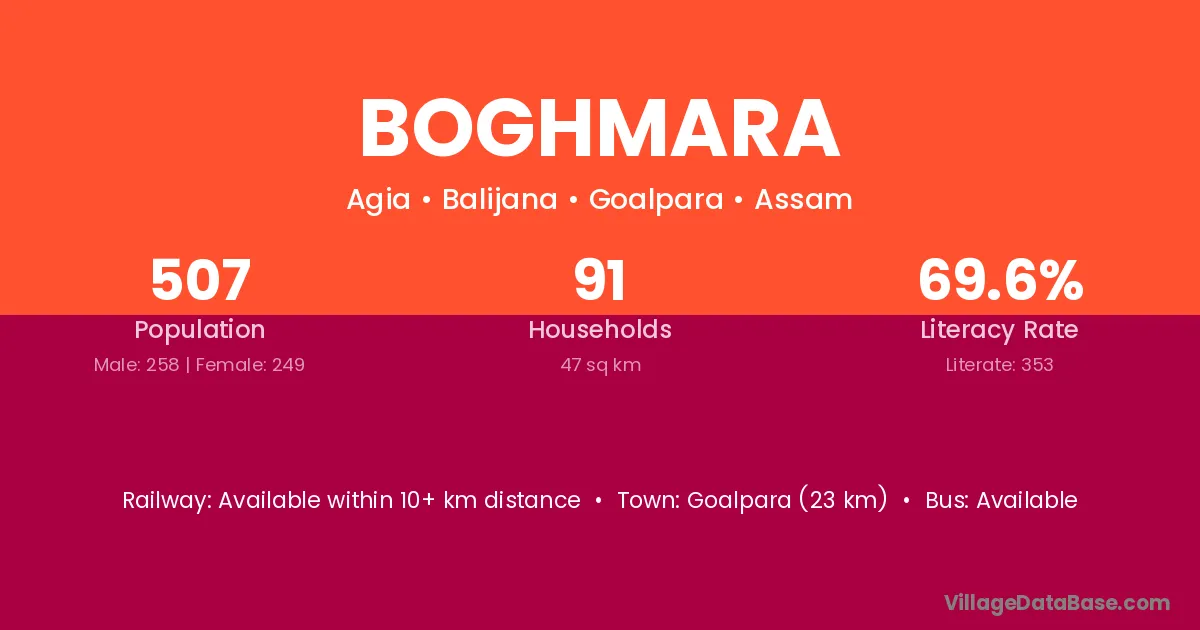 Goalpara (23 km) is the nearest town to Boghmara village for major economic activities and is located approximately 23 km away.