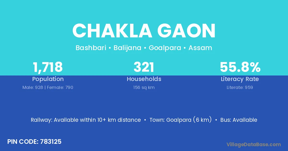 Goalpara (6 km) is the nearest town to Chakla Gaon village for major economic activities and is located approximately 6 km away.