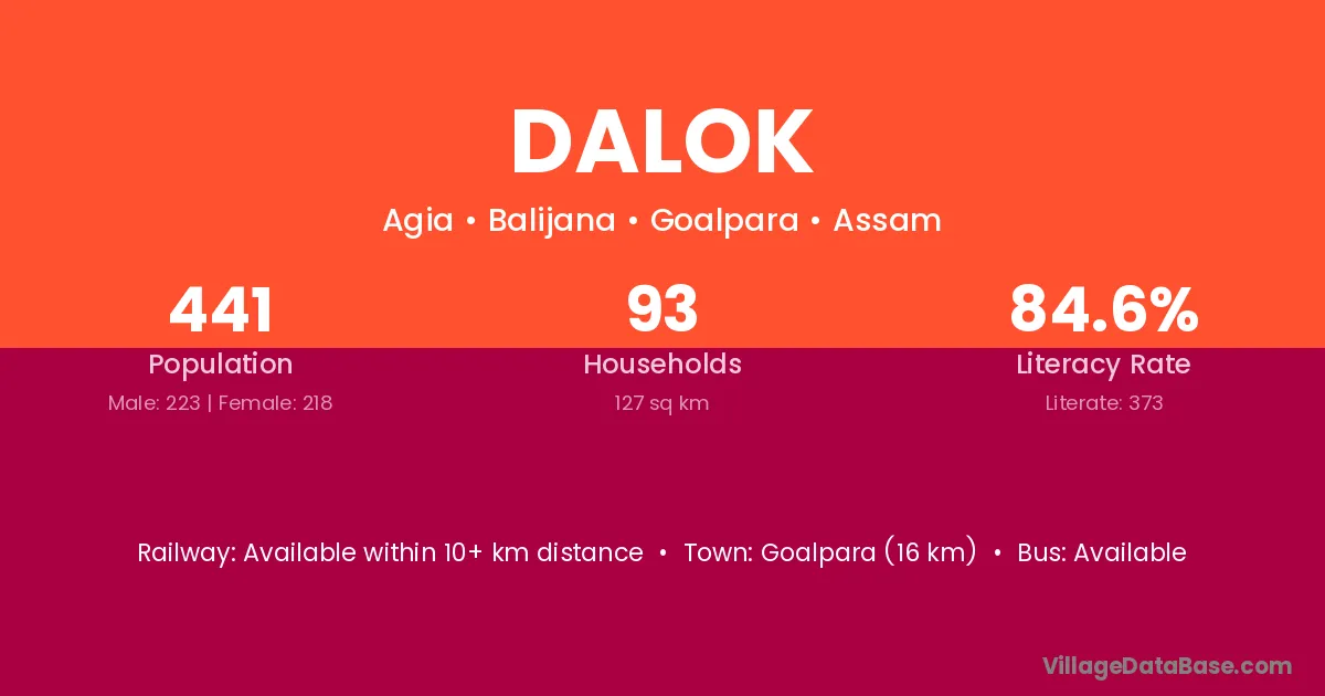 Goalpara (16 km) is the nearest town to Dalok village for major economic activities and is located approximately 16 km away.