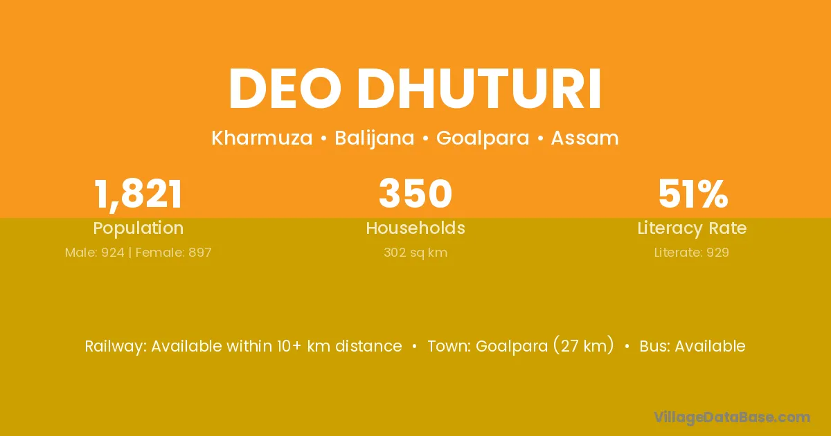 Goalpara (27 km) is the nearest town to Deo Dhuturi village for major economic activities and is located approximately 27 km away.