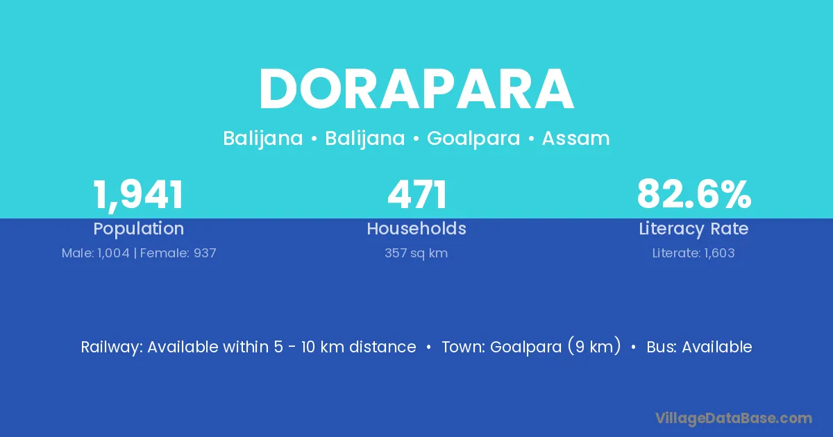 Goalpara (9 km) is the nearest town to Dorapara village for major economic activities and is located approximately 9 km away.