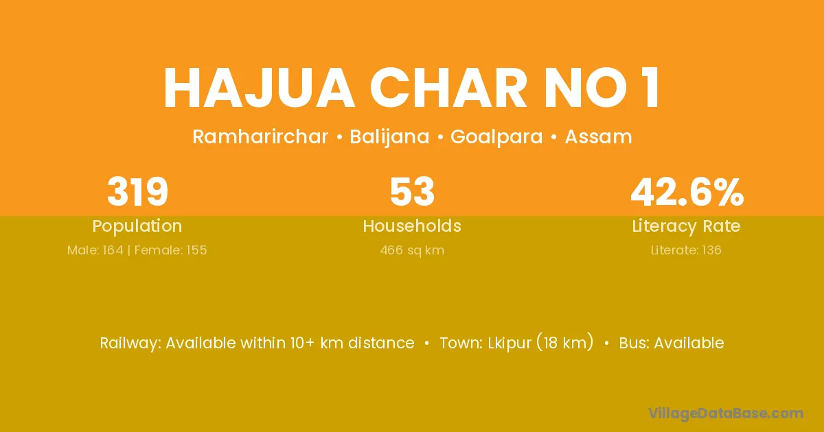 Lkipur (18 km) is the nearest town to Hajua Char No 1 village for major economic activities and is located approximately 18 km away.