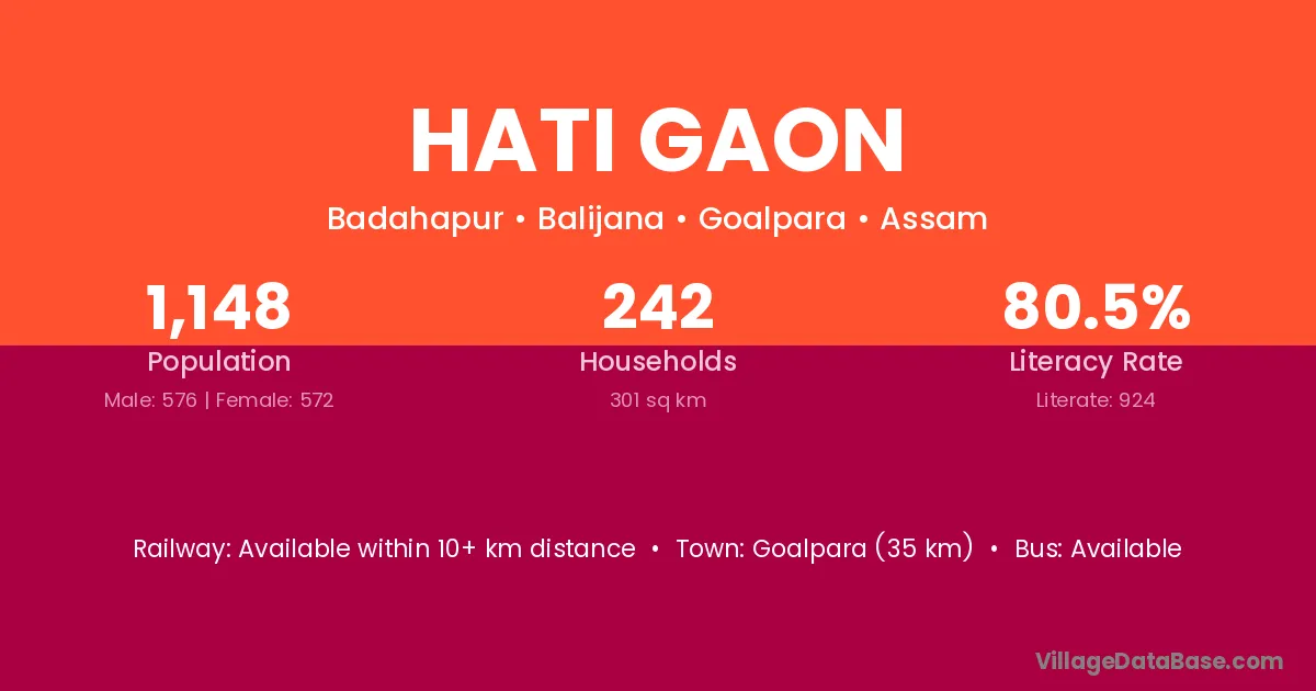 Goalpara (35 km) is the nearest town to Hati Gaon village for major economic activities and is located approximately 35 km away.