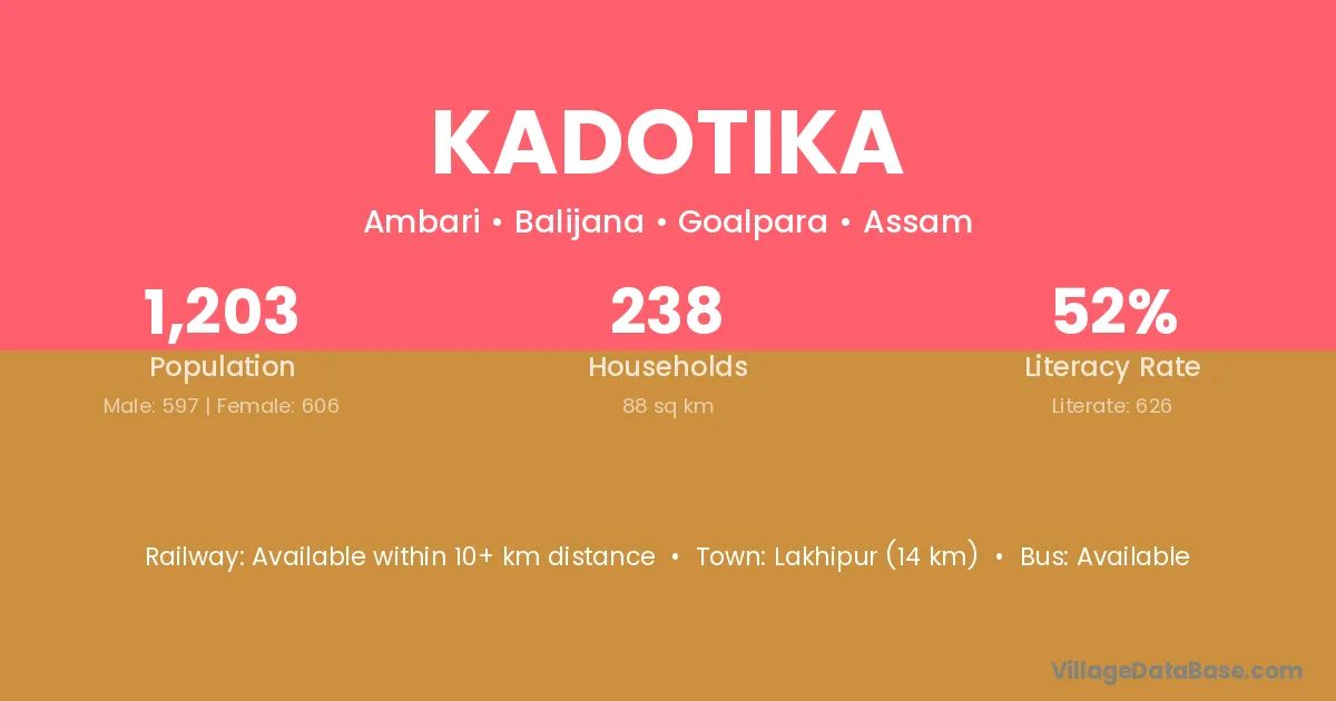 Lakhipur (14 km) is the nearest town to Kadotika village for major economic activities and is located approximately 14 km away.
