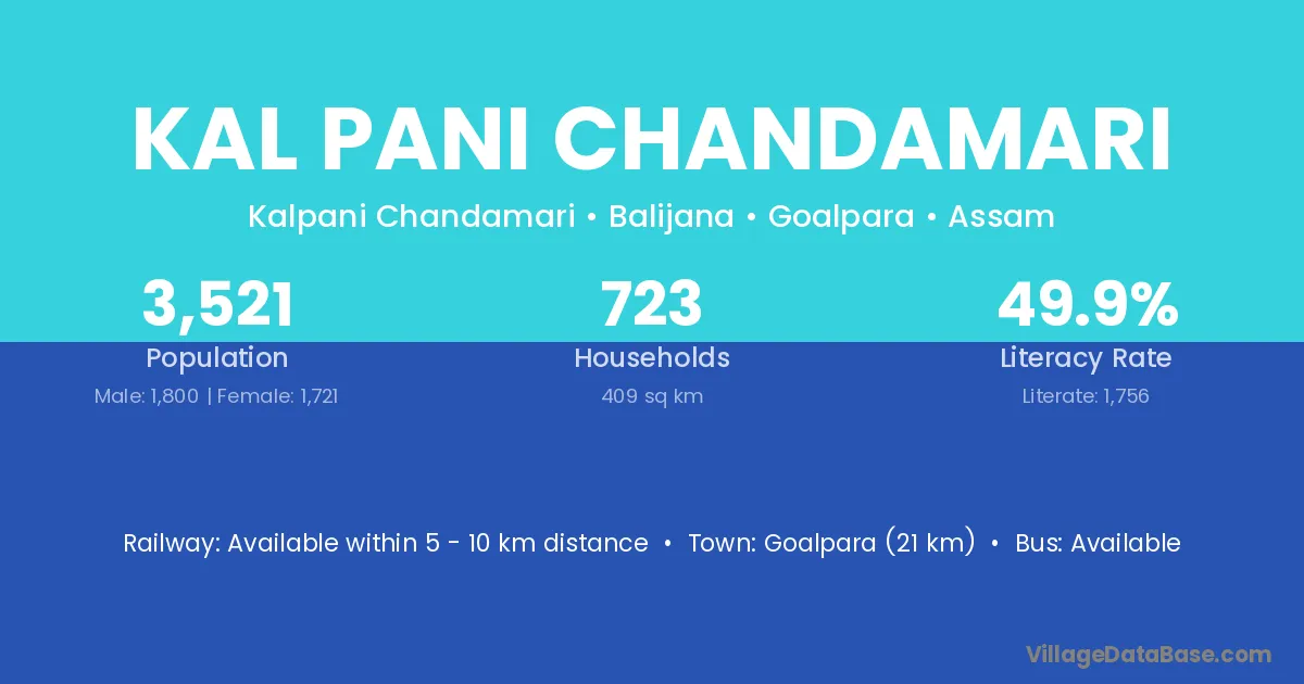 Goalpara (21 km) is the nearest town to Kal Pani Chandamari village for major economic activities and is located approximately 21 km away.