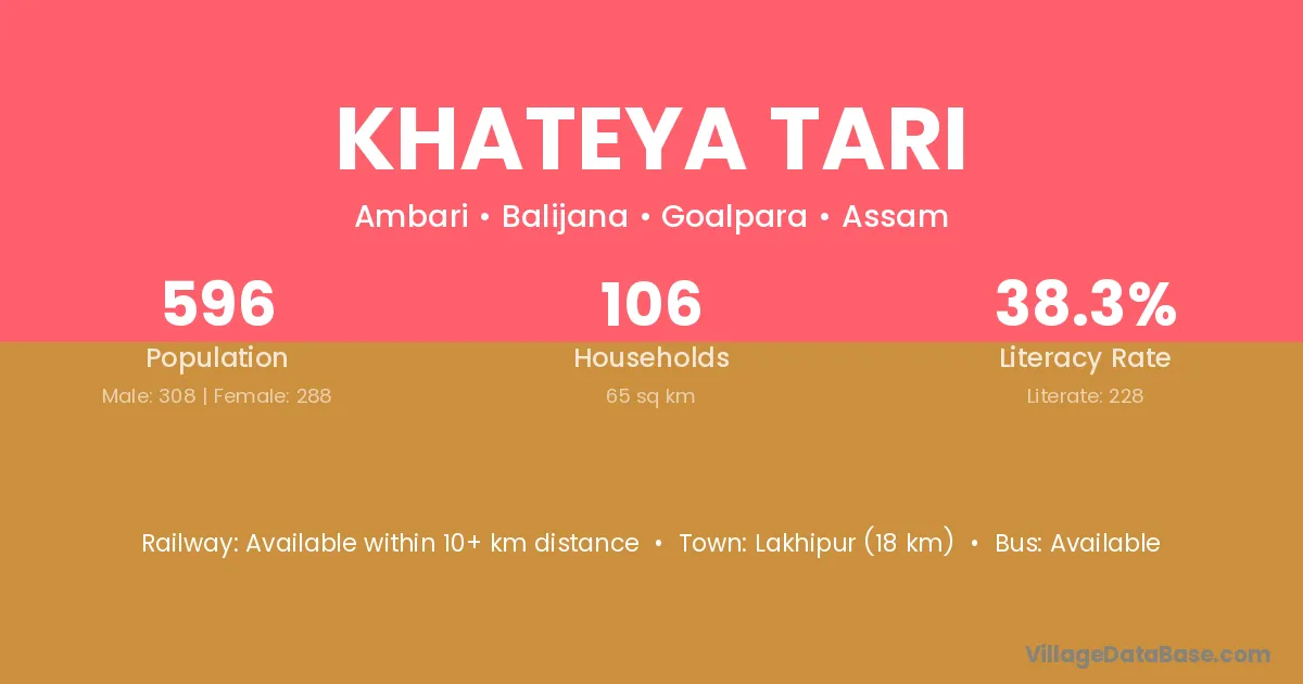 Lakhipur (18 km) is the nearest town to Khateya Tari village for major economic activities and is located approximately 18 km away.