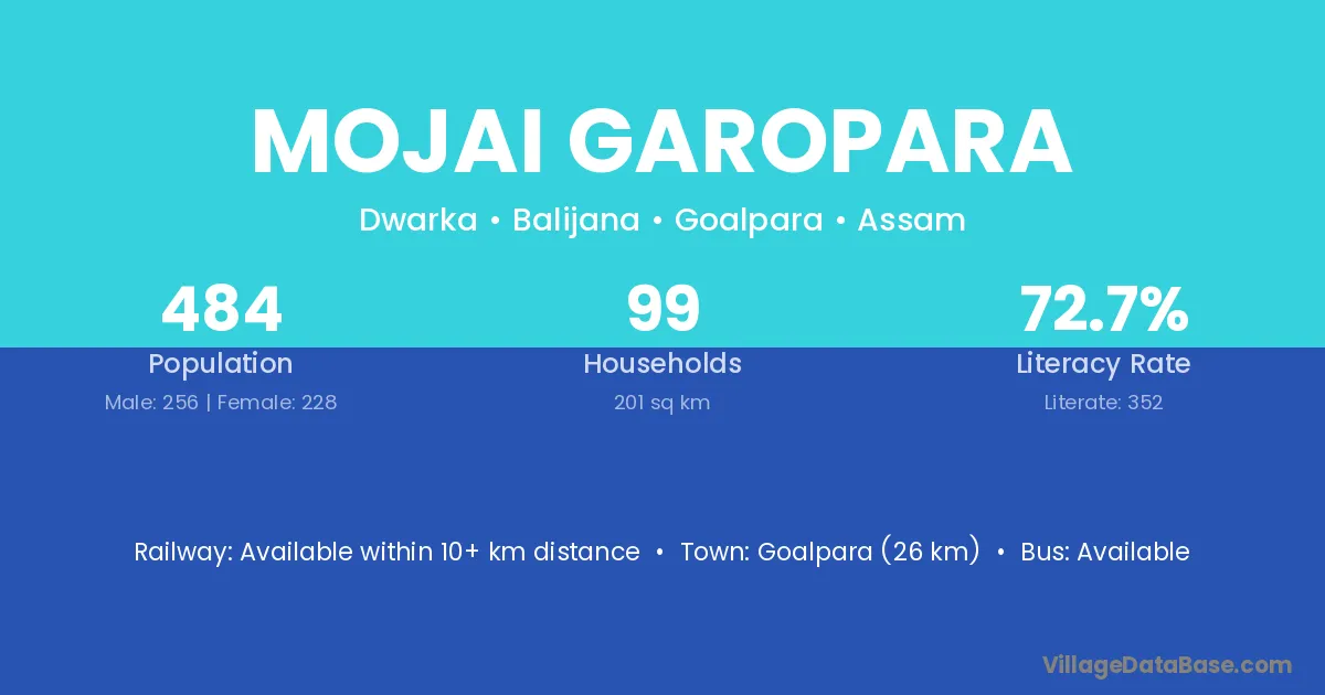Goalpara (26 km) is the nearest town to Mojai Garopara village for major economic activities and is located approximately 26 km away.