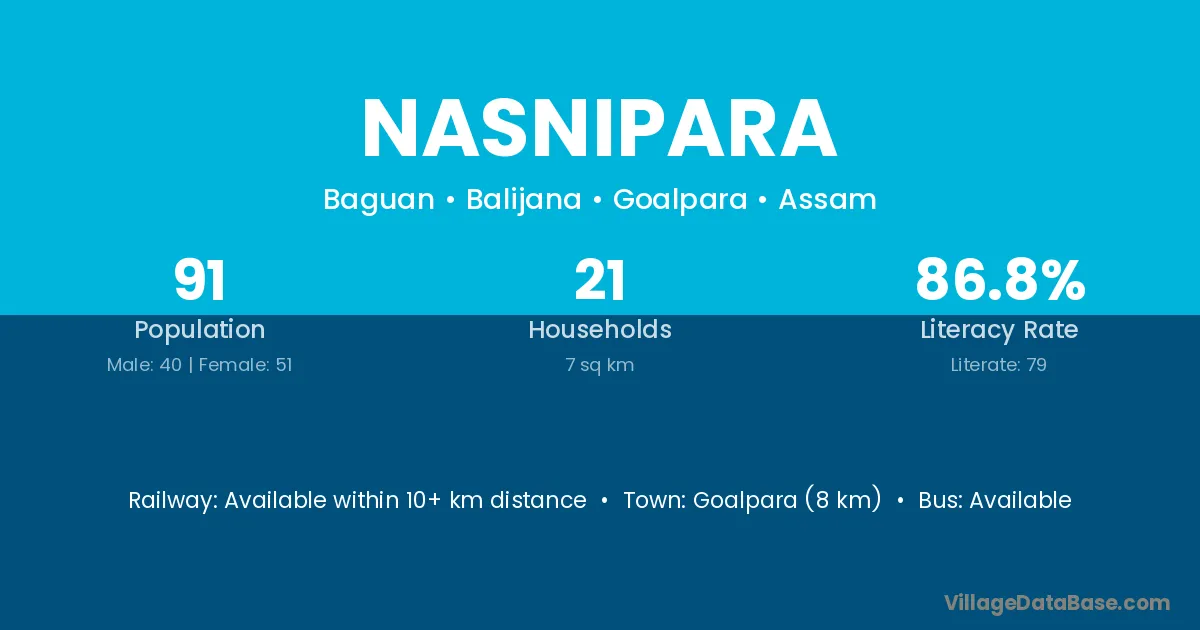 Goalpara (8 km) is the nearest town to Nasnipara village for major economic activities and is located approximately 8 km away.
