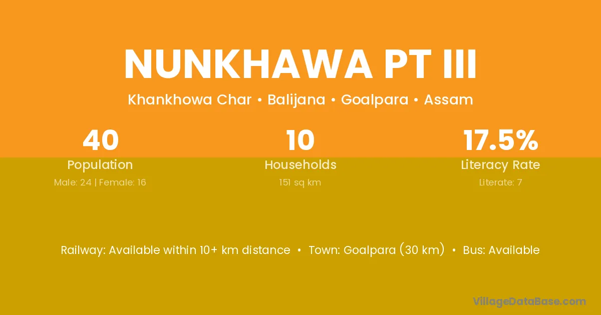 Goalpara (30 km) is the nearest town to Nunkhawa Pt Iii village for major economic activities and is located approximately 30 km away.