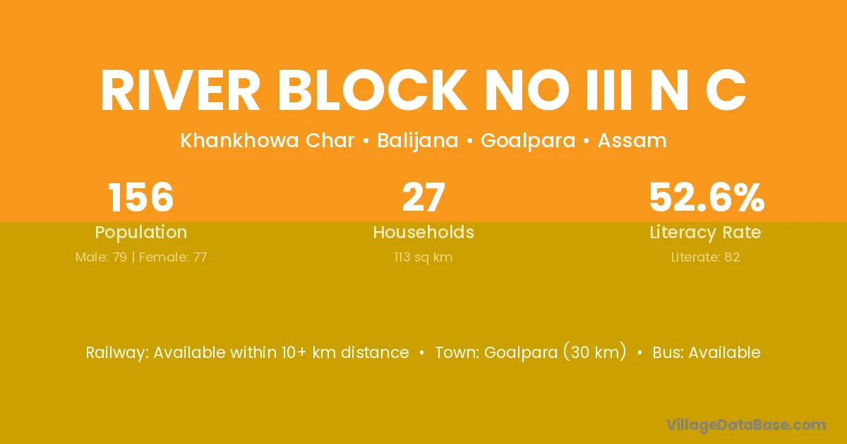 Goalpara (30 km) is the nearest town to River Block No Iii N C village for major economic activities and is located approximately 30 km away.