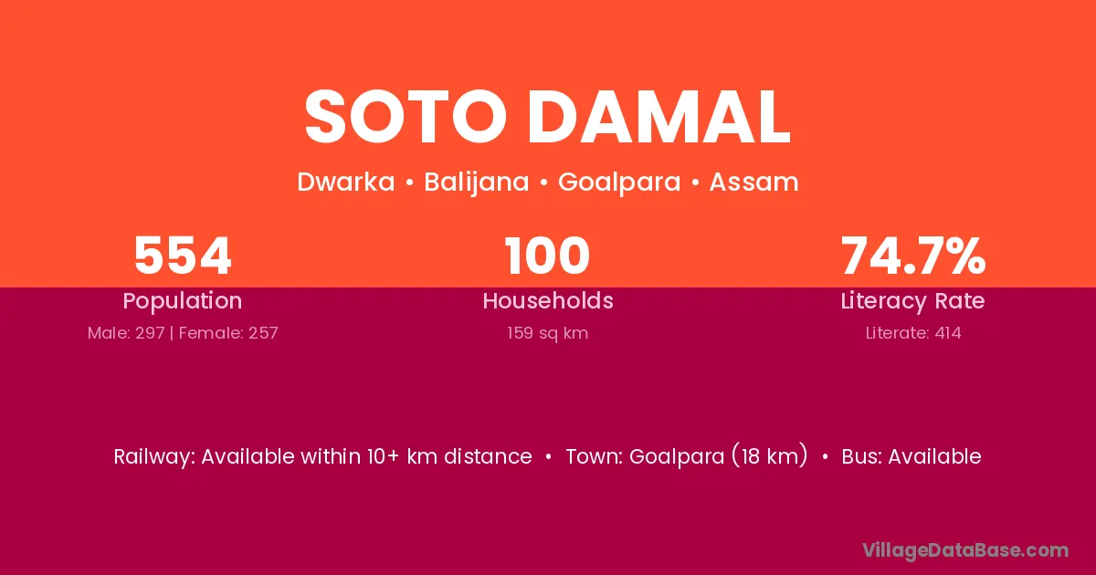 Goalpara (18 km) is the nearest town to Soto Damal village for major economic activities and is located approximately 18 km away.