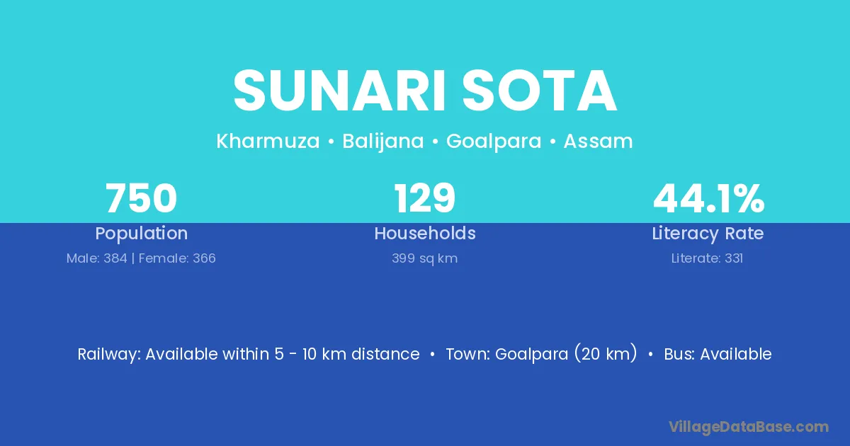 Goalpara (20 km) is the nearest town to Sunari Sota village for major economic activities and is located approximately 20 km away.